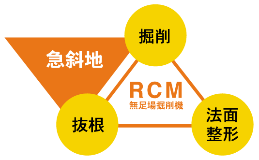 RCM(無足場掘削機)は急斜地で足場を作らずに掘削、抜根等の法面整形が可能です。それにより安全性を確保し大幅な時間の削減を可能にいたします。