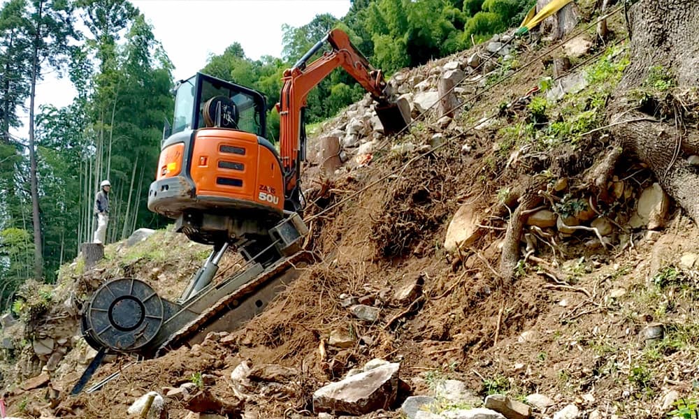 RCM(無足場掘削機)は急斜地で足場を作らずに掘削、抜根等の法面整形が可能です。それにより安全性を確保し大幅な時間の削減を可能にいたします。
