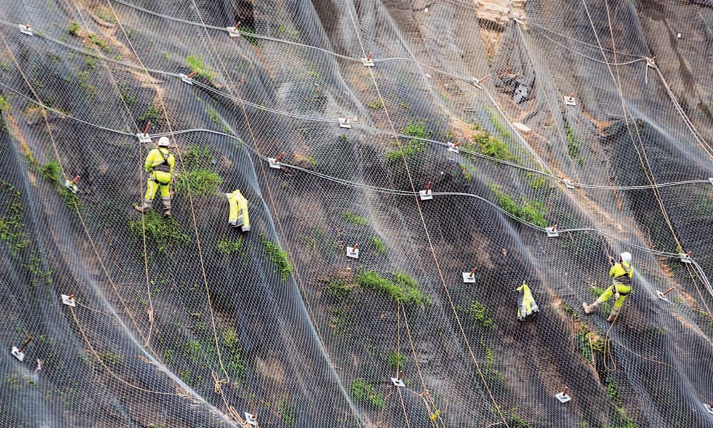 落石防止網工は、落石による災害を未然に防止するために、万が一落石が発生した場合、落石を止めたり、通行車両等への保護対象に落石が当たらないように落石物を誘導したりするための工法です。